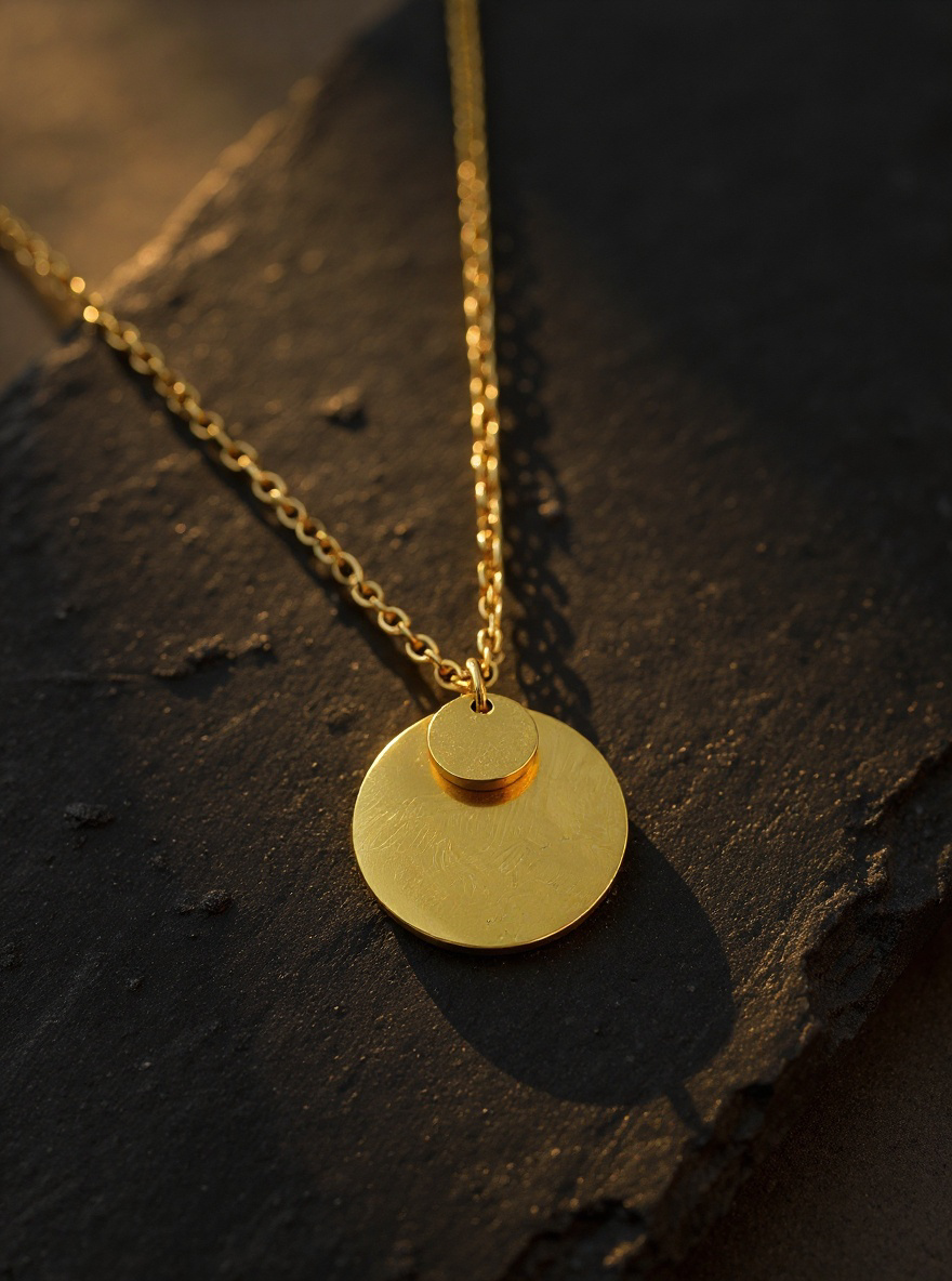 Ce collier en acier inoxydable doré séduit par son pendentif rond aux lignes sobres et élégantes. Discret mais lumineux, il capte la lumière à chaque mouvement et sublime votre style avec finesse.