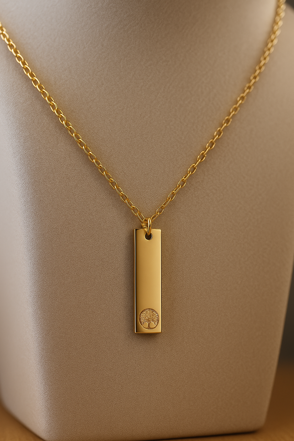 Son pendentif unique se compose d’une tige verticale minimaliste prolongée d’un arbre de vie finement travaillé. Ce bijou symbolique allie modernité, spiritualité et élégance discrète, pour un look à la fois chic et porteur de sens.